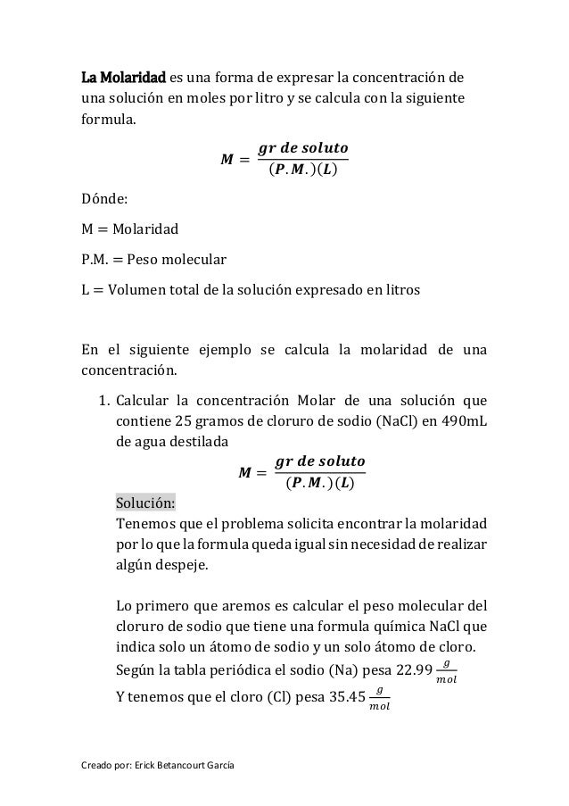 Molaridad Concentracion Unidades Calculo Ejercicios