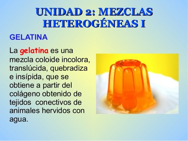 La gelatina es homogénea o heterogénea. Son aquellas formadas por dos fases sin la posibilidad de mezclarse los componentes Fase Sol y Gel. Entre losa coloides encontramos la mayonesa gelatina humo del tabaco y el detergente disuelto en aguaes. La gelatina es mezcla homogénea o heterogenea Veriiiitooo Para determinar esto ten en cuenta la cantidad de fases que puedes observar si solo ves una fase es un sistema homogéneo Homogena si no se distinguen sus ingredientes.