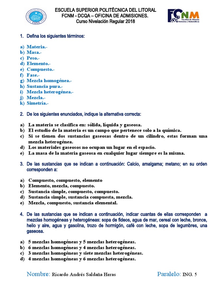 Deber N 4 Tarea 2 Clasif De Materia Mezcla Sustancias Quimicas
