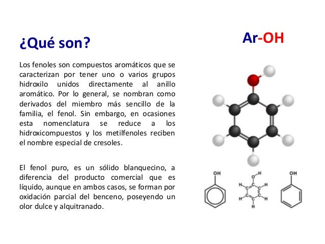 Fenoles Formula General Ar Oh N Grupo Funcional O H Los Fenoles Son Derivados De Los Alcoholes Son Muy Solubles En Agua Y En La Mayoria De Los Disolventes Organicos Son Altamente Toxicos Para El Ser Humano Y Su Contacto
