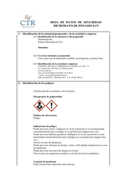 Dicromato De Potasio 0 1n Msds Ctr Scientific