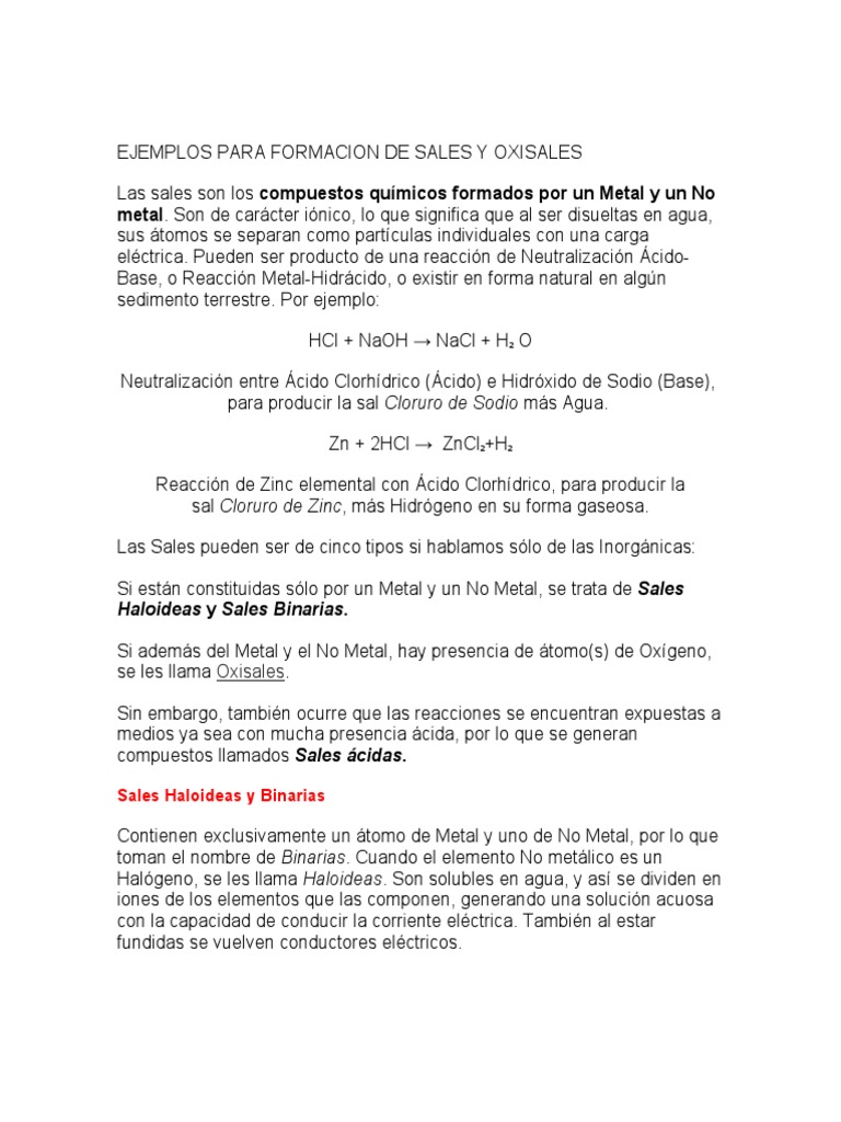 Ejemplos Para Formacion De Sales Y Oxisales Pdf Sal Quimica Acido