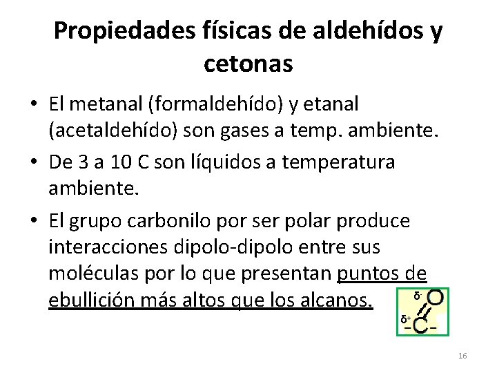 Propiedades Físicas Los compuestos carbonílicos presentan puntos de ebullición más bajos que los alcoholes de su mismo peso molecularNo hay grandes diferencias. Las pequeñas tienen un olor agradable.