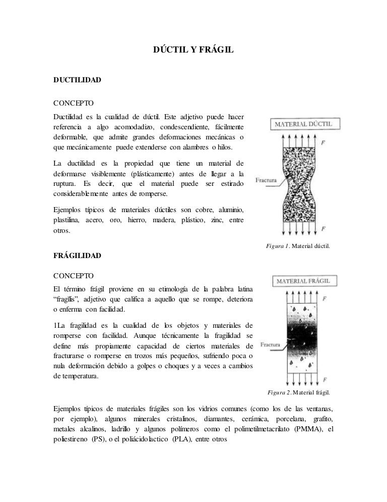 La ductilidad y fragilidad son ejemplos de estas propiedades que indican la resistencia de un material. Un material dúctil es el que tiene un alargamiento a tracción relativamente grande hasta llegar al punto de rotura por ejemplo el acero estructural o el aluminio mientras que un material frágil.