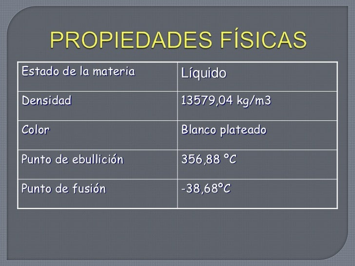 Propiedades fisicas y quimicas de mercurio El mercurio es un elemento metálico peculiar ya que es el único metal que se encuentra en estado líquido a temperatura ambiente.
